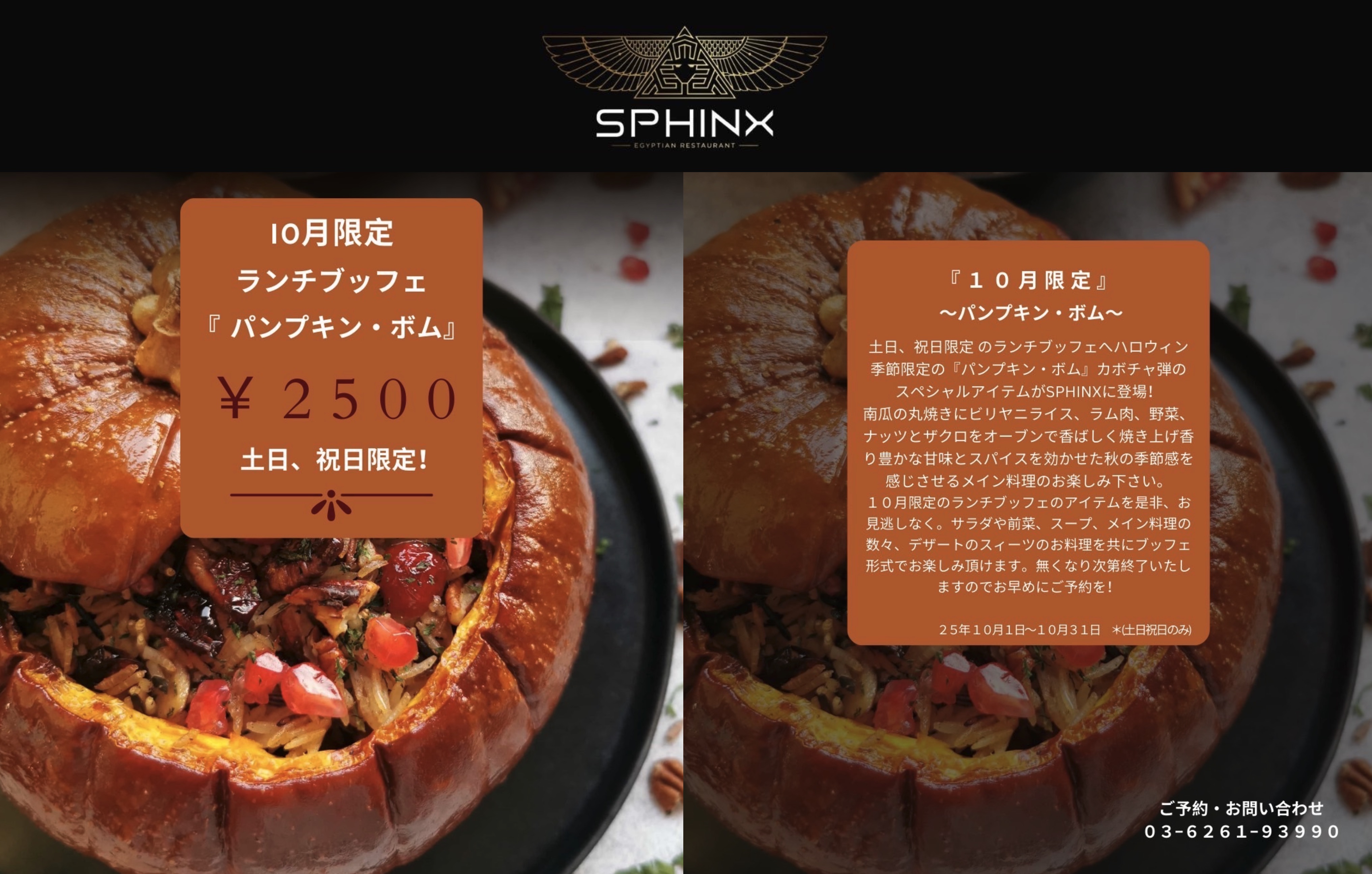 【土日、祝日ランチ限定】スペシャルビュッフェ食べ放題 Special Menu◆10月限定『パンプキン・ボム』◆ 約25種類の料理と2種類デザート込み。エジプトのサービスドリンク飲み放題